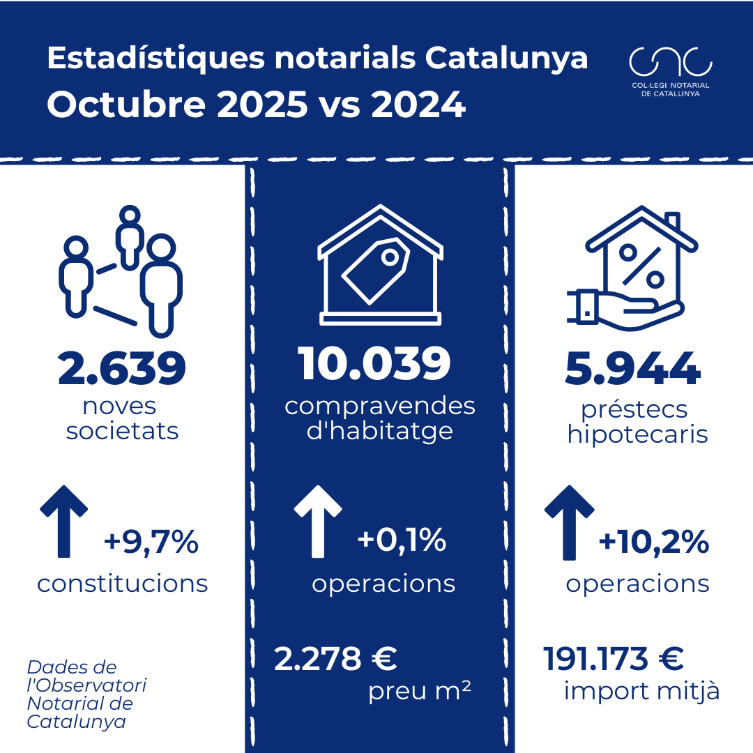 Raquel Iglesias, vicedegana del Col·legi Notarial de Catalunya, assenyala que “les xifres de compravendes d’habitatge a Catalunya es mantenen estables, després de l’etapa de continu creixement que va finalitzar el juny de 2025. Per contra, els préstecs hipotecaris continuen la seva evolució a l’alça, sumant ja 18 mesos consecutius de creixement. En aquest context, el preu per metre quadrat dels habitatges segueix la mateixa tendència que les hipoteques i no deixa d’incrementar.”