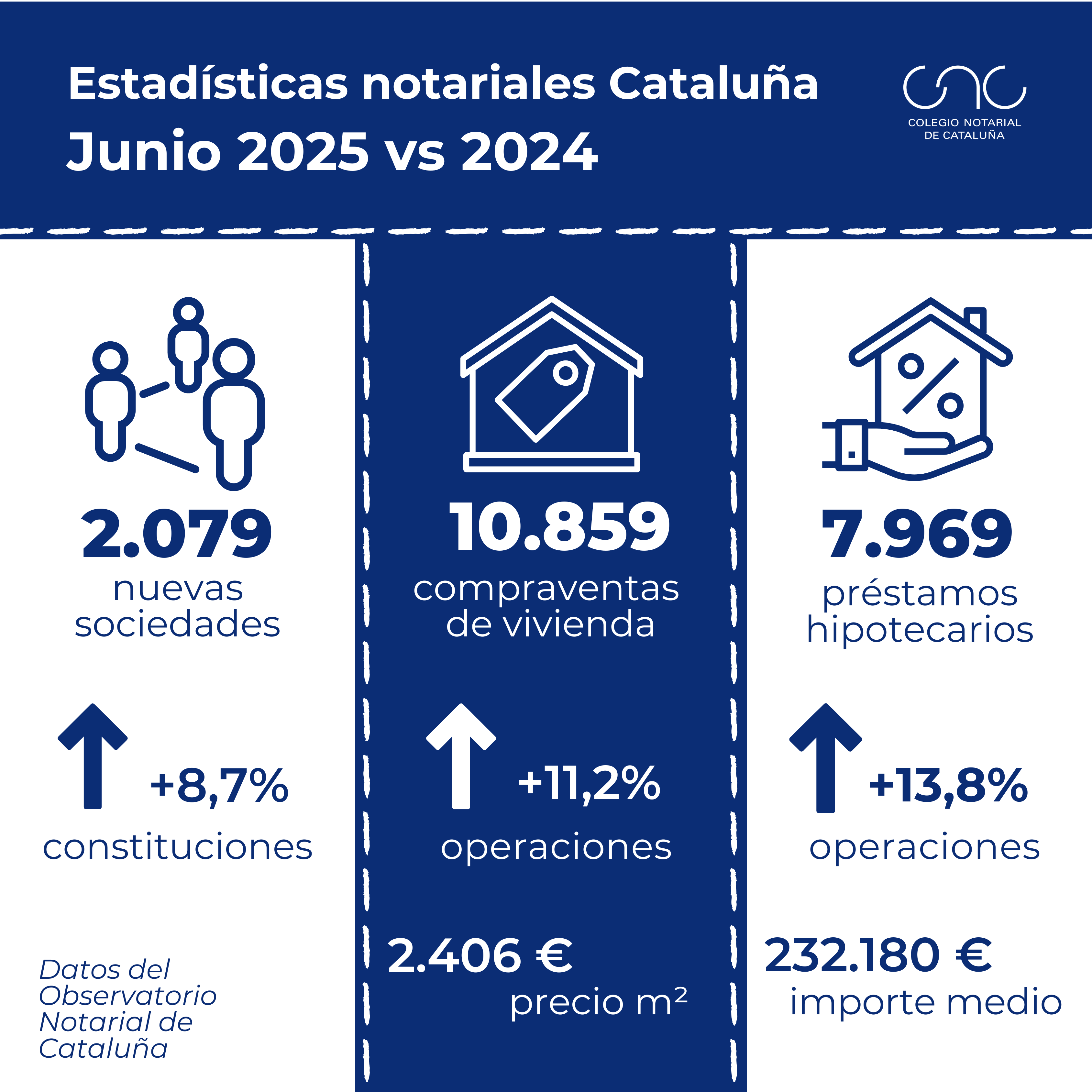 Raquel Iglesias, vicedecana del Colegio Notarial de Cataluña, señala que “continúa la tendencia al alza de los préstamos hipotecarios, sostenida desde abril de 2024, mientras que el número de compraventas de viviendas recupera su crecimiento tras el moderado descenso producido en mayo. Como consecuencia del aumento de este tipo de operaciones, el precio medio por metro cuadrado también sigue creciendo, alcanzando en este mes de junio su máximo valor en los últimos años, pero situándose aún lejos de los valores de los años de la burbuja inmobiliaria.”